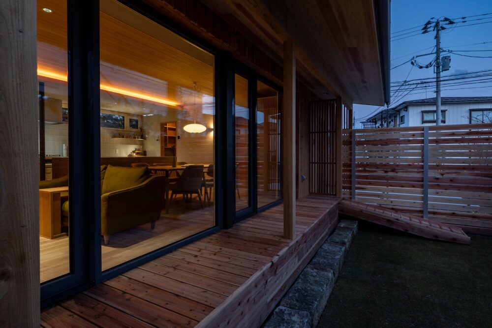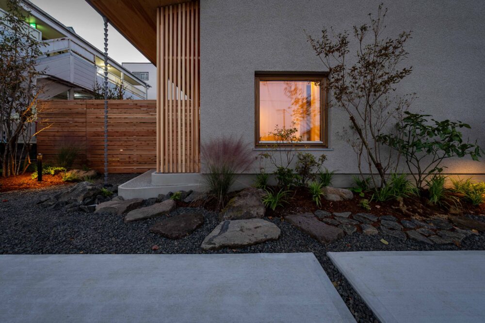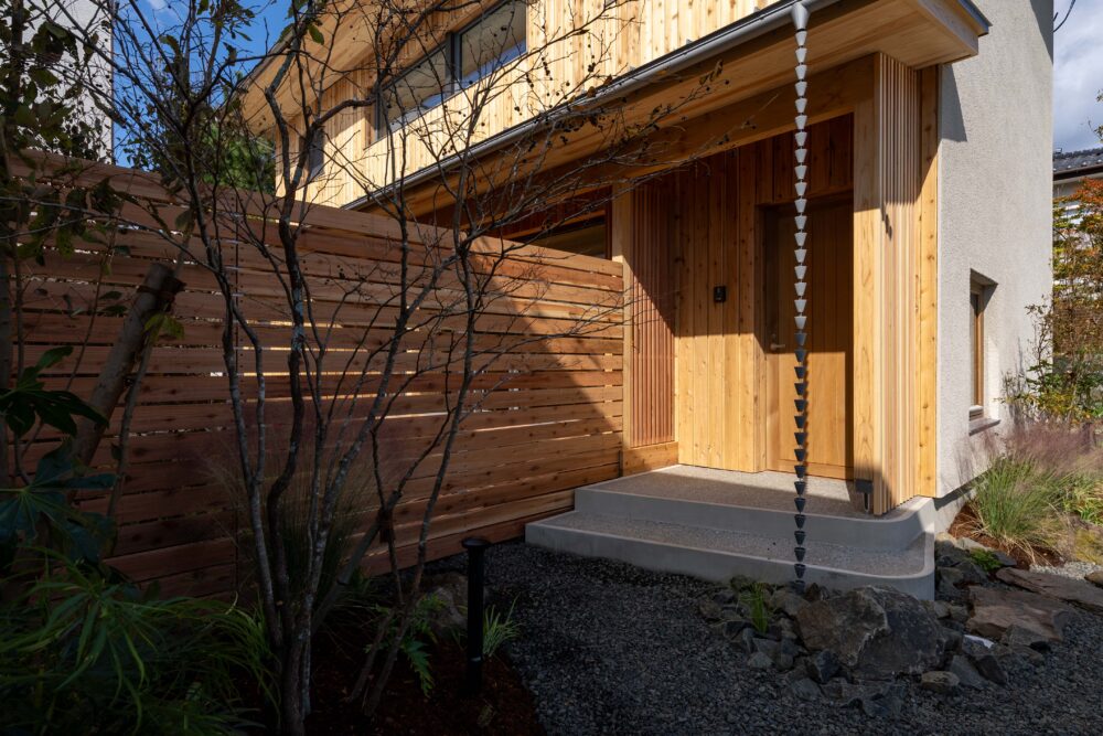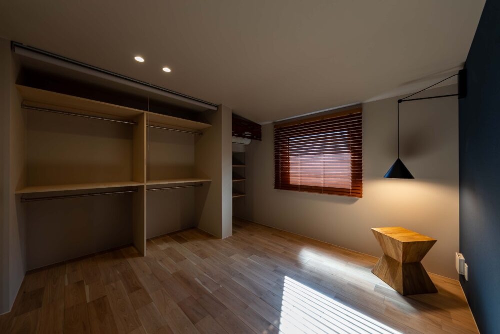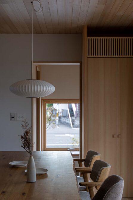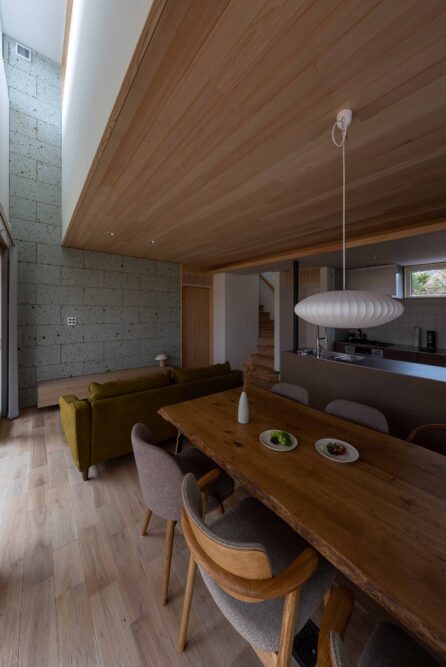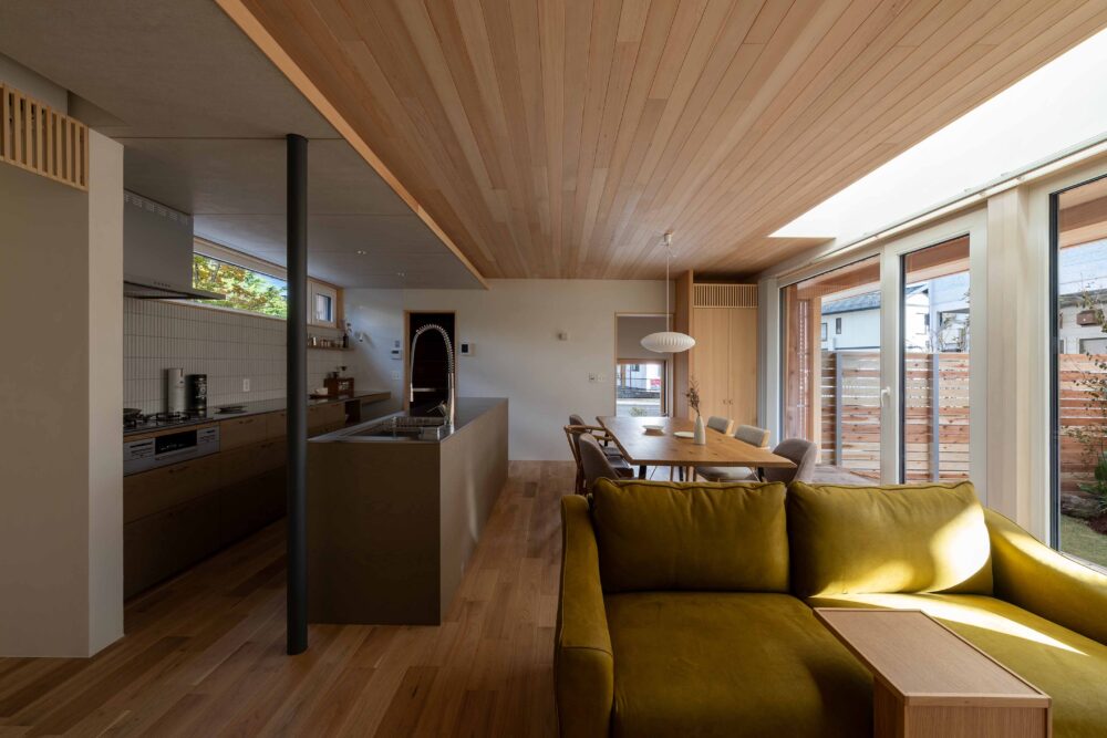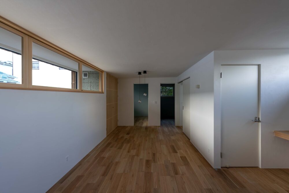 南側に集合住宅が近接して建築されており、採光や眺望の観点での工夫が必要な土地でした。1階の暗くなりがちなリビングは、採光を目的とした吹抜けにハイサイドライトを設け、自然光をリビングへ導きます。また、夏場の日よけとして、太陽高度を考慮した軒の出と下屋により、夏の強い日差しを遮ります。さらに、2階のセカンドリビングには、吹抜けとの間仕切りにガラス戸を設け、1階からの音の伝わりを最小限に抑えつつ、2階にも自然光を採り入れます。