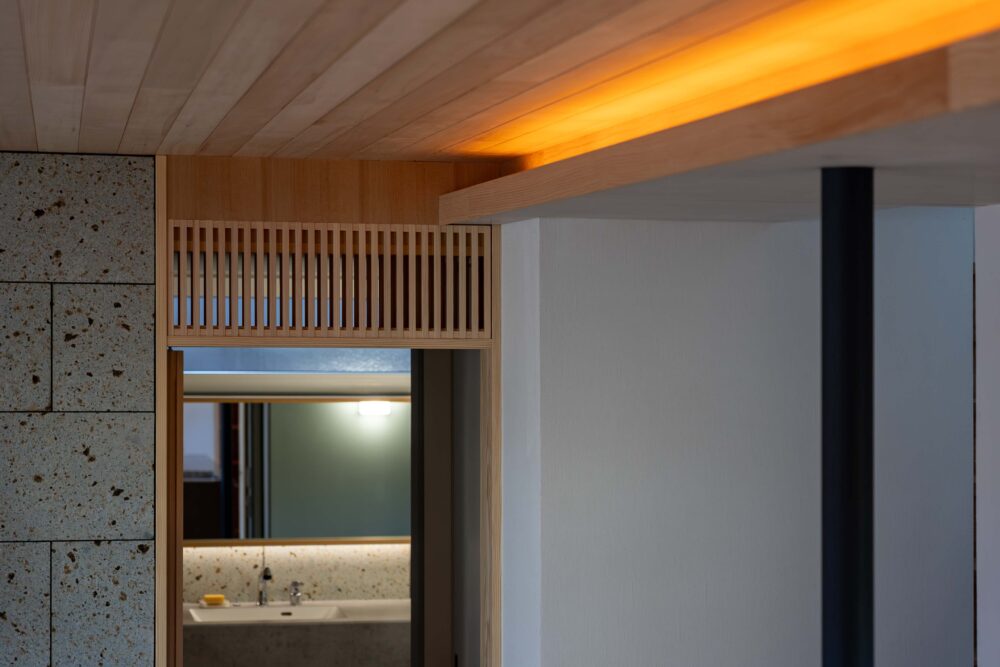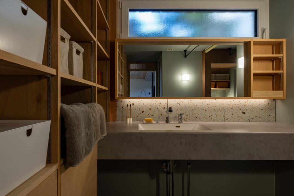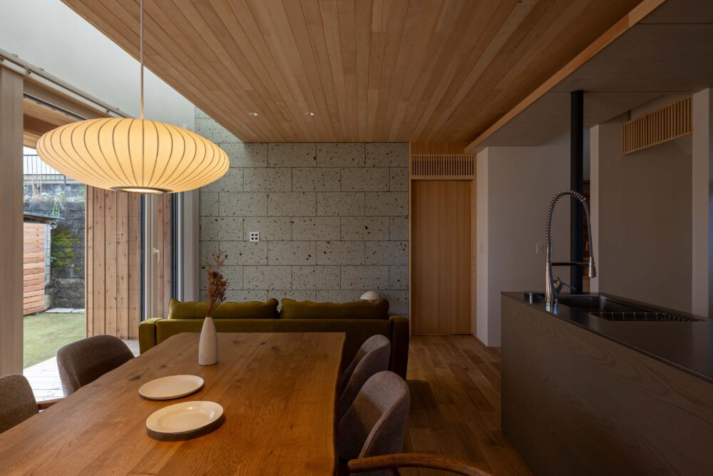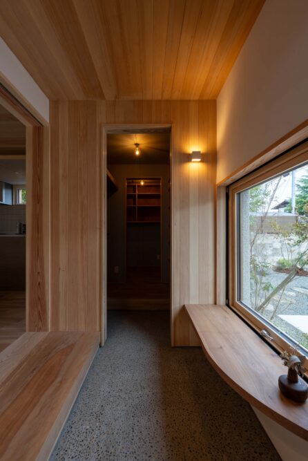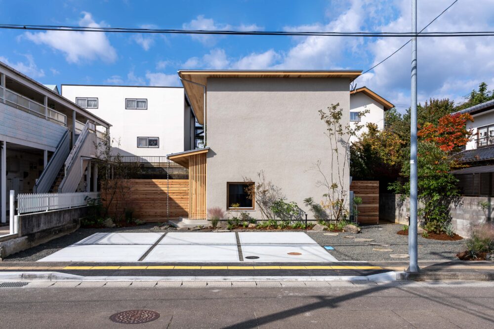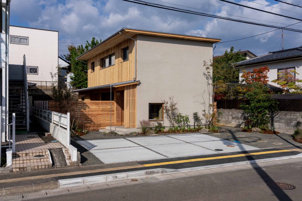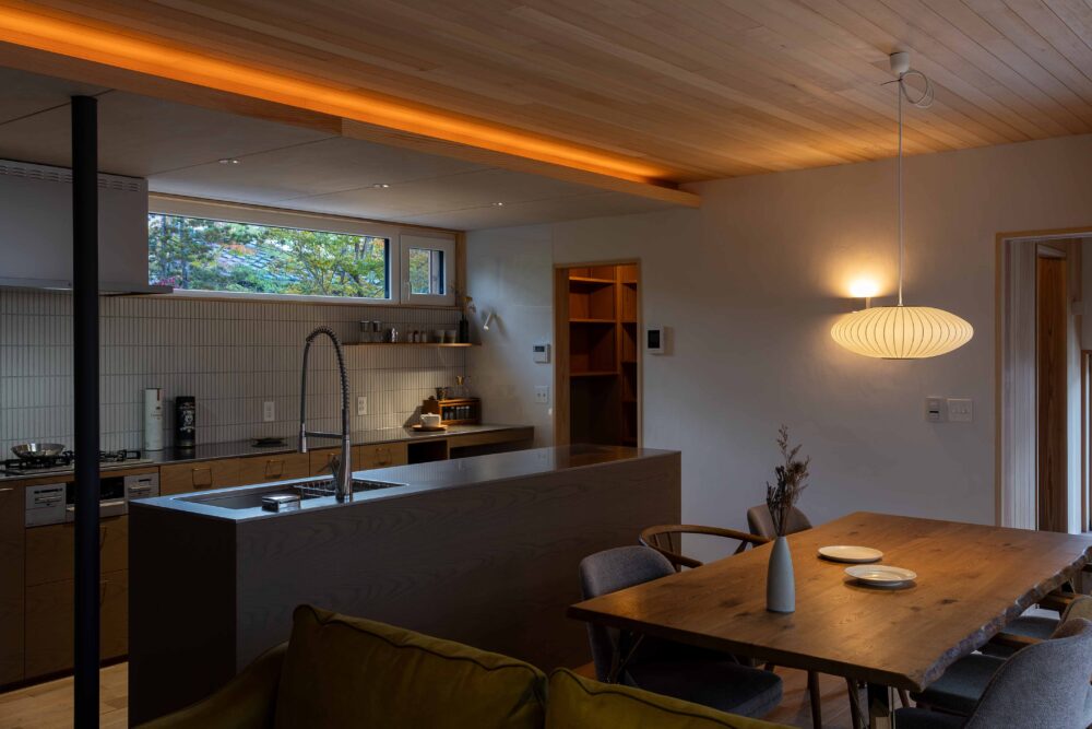 南側に集合住宅が近接して建築されており、採光や眺望の観点での工夫が必要な土地でした。1階の暗くなりがちなリビングは、採光を目的とした吹抜けにハイサイドライトを設け、自然光をリビングへ導きます。また、夏場の日よけとして、太陽高度を考慮した軒の出と下屋により、夏の強い日差しを遮ります。さらに、2階のセカンドリビングには、吹抜けとの間仕切りにガラス戸を設け、1階からの音の伝わりを最小限に抑えつつ、2階にも自然光を採り入れます。
