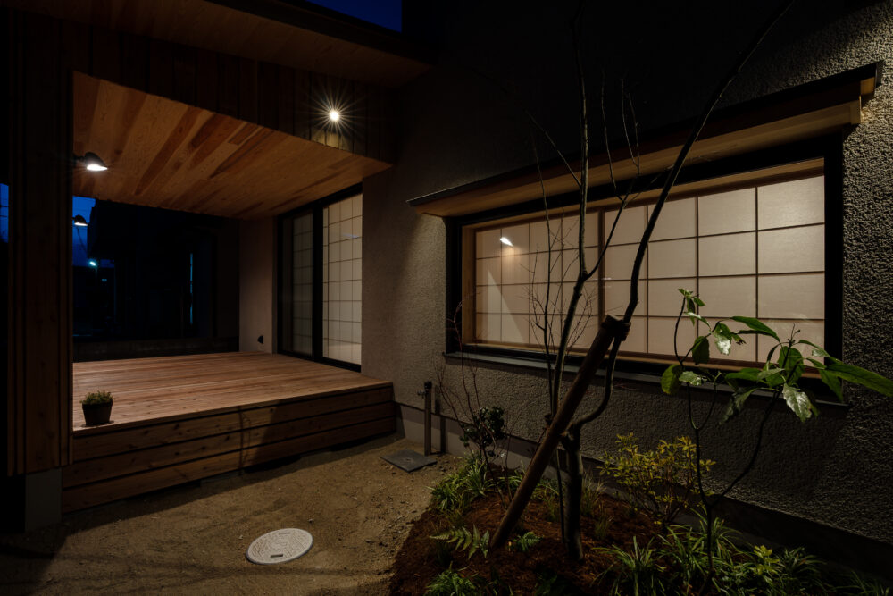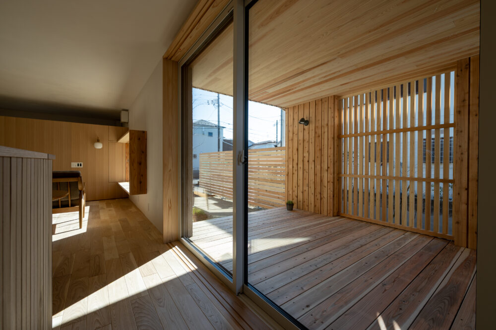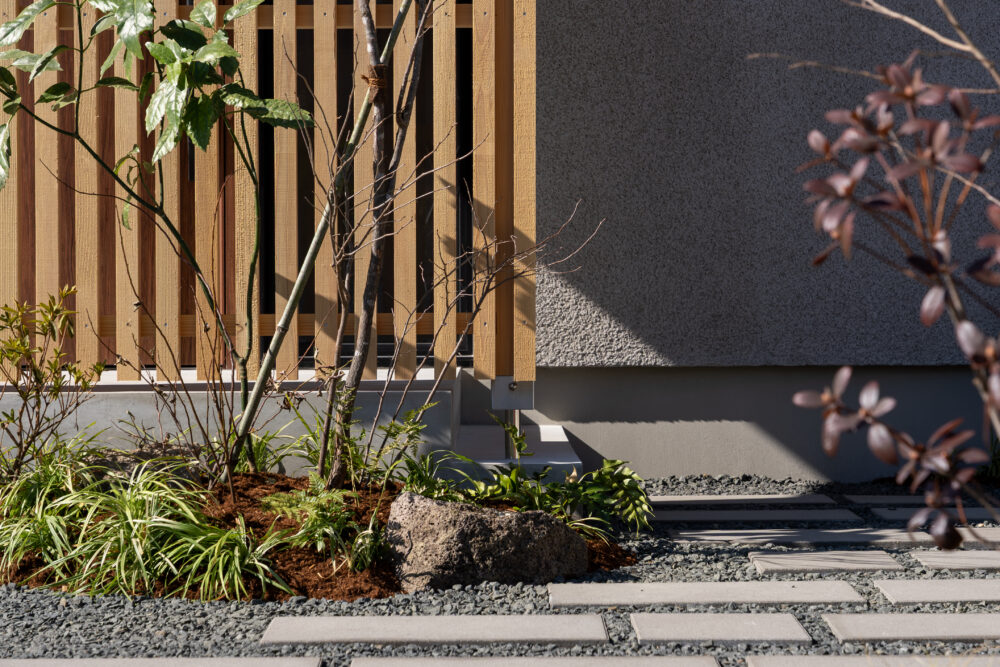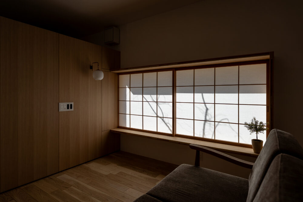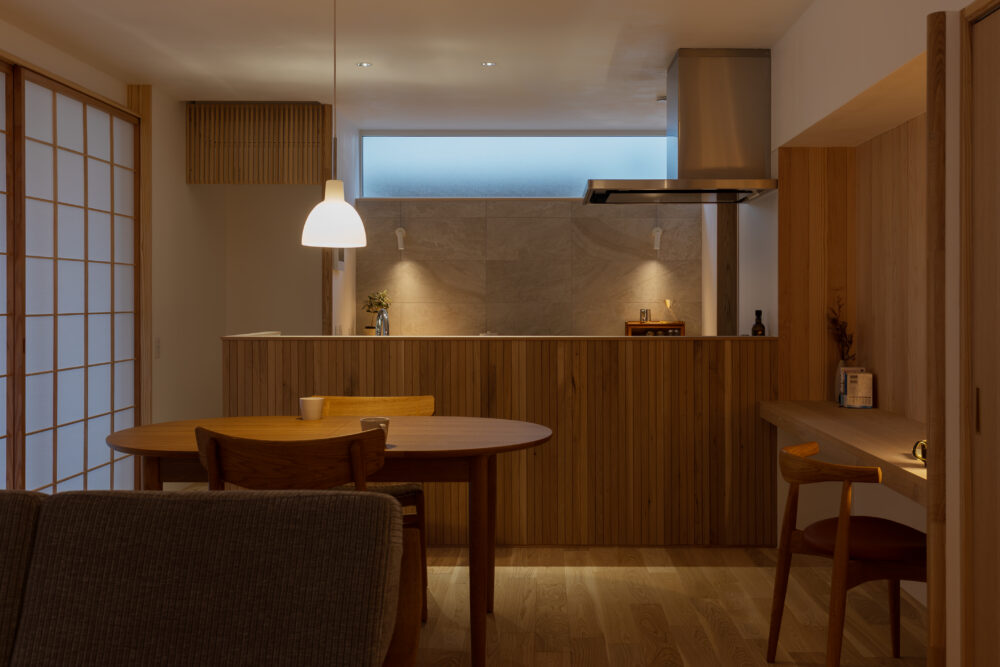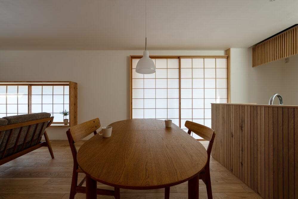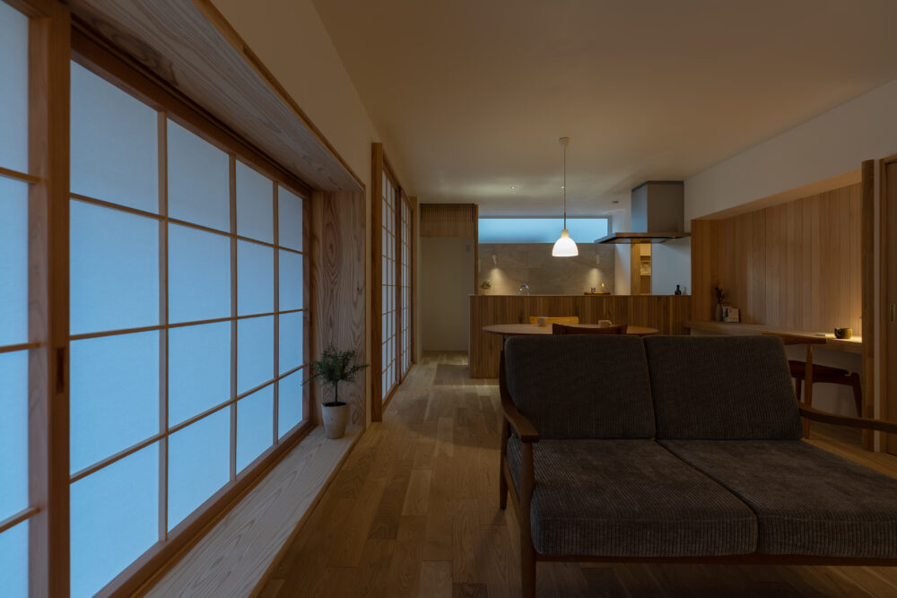 家族団らんを育む空間をコンセプトに、内と外をゆるやかに結ぶことで、暮らしの豊かさを見出しました。周辺環境は隣地が立ち並び、日当たりの悪さが課題となる敷地でした。そこで、敷地の南東に庭を設けることで、自然光を室内に導くための「余白」を生みだし、朝から昼過ぎにかけて、居間の南面に配した腰高の窓から豊かな自然光を室内に届けます。その採光のための窓は、重心を低く下げたことで空間に落ち着きをもたらしてくれます。さらに、ちょっとした遊び心も織り交ぜ、窓枠を深く設けることで腰かけのベンチとして活用でき、自然と窓際に誘われ、庭の緑を感じながら外とゆるやかな繋がりを楽しめます。