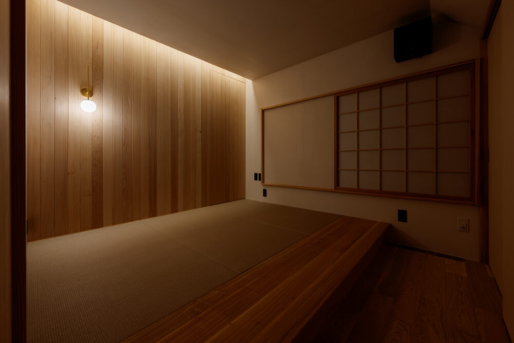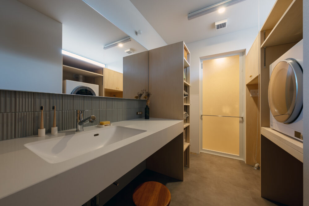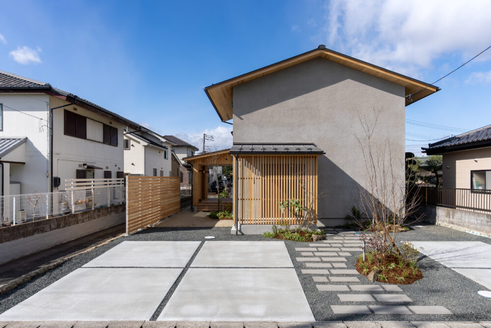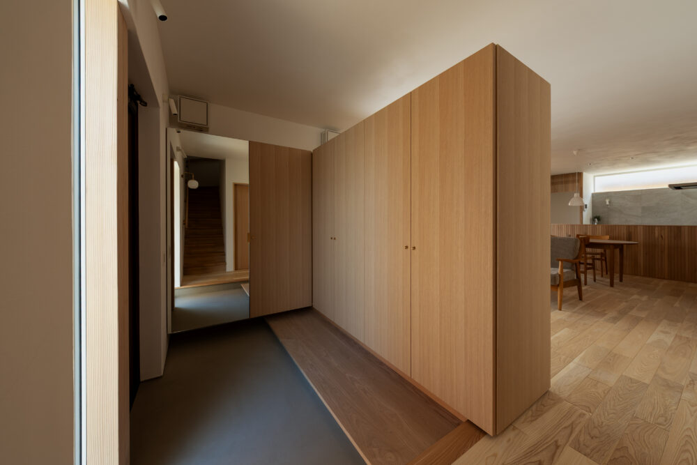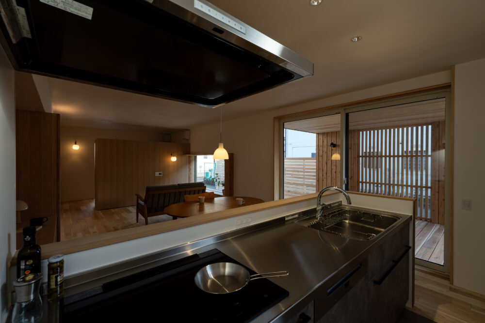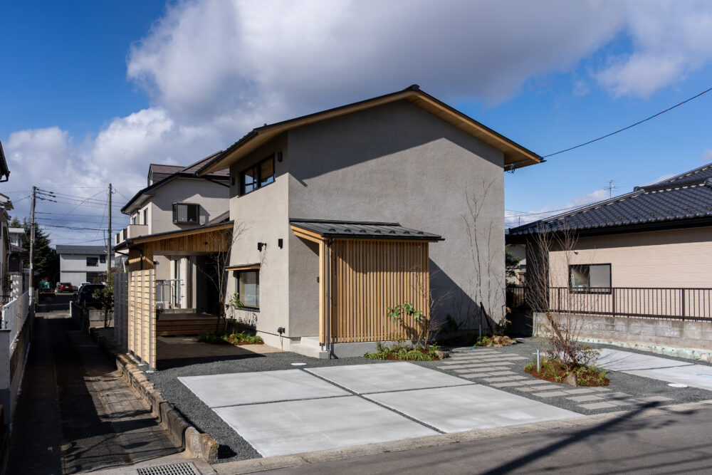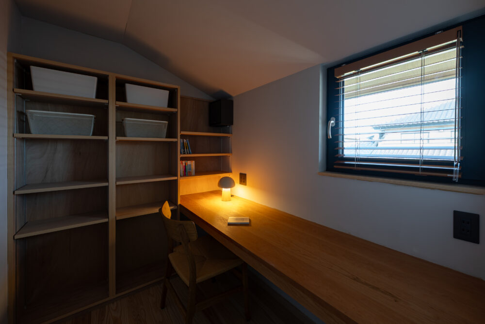 家族団らんを育む空間をコンセプトに、内と外をゆるやかに結ぶことで、暮らしの豊かさを見出しました。周辺環境は隣地が立ち並び、日当たりの悪さが課題となる敷地でした。そこで、敷地の南東に庭を設けることで、自然光を室内に導くための「余白」を生みだし、朝から昼過ぎにかけて、居間の南面に配した腰高の窓から豊かな自然光を室内に届けます。その採光のための窓は、重心を低く下げたことで空間に落ち着きをもたらしてくれます。さらに、ちょっとした遊び心も織り交ぜ、窓枠を深く設けることで腰かけのベンチとして活用でき、自然と窓際に誘われ、庭の緑を感じながら外とゆるやかな繋がりを楽しめます。